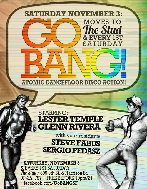 Saturday, November 3, 2012 - 9:00pm until 2:00am Go BANG! Atomic Dancefloor Disco Action! SATURDAY November 3, 2012 *1st Saturday Of The Month!* THE STUD / 399 9th St. & Harrison St. 9P-3A!+ / $7 + FREE BEFORE 10P / 21+ http://www.facebook.com/GoBANGSF STARRING: *LESTER TEMPLE (Returns to the DJ Booth after 15 years!) http://www.facebook.com/lester.temple.5 *GLENN RIVERA (Shades of Seventies) (Returns for BANG! #4!) http://www.shadesofseventies.com/restructure.html + http://shadesofseventies.blogspot.com/ + http://glennrivera.multiply.com/ WITH YOUR RESIDENTS *Steve Fabus http://www.facebook.com/profile.php?id=1000016615 *Sergio Fedasz http://www.facebook.com/sergioaudio